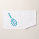 Custom printed hand towel for tennis sports bag with a unique turquoise teal blue tennis racket monogram initial design on a simple and modern, minimal personalized design for an avid or beginning tennis player or coach.