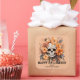 This customizable Halloween sticker features an ornate sugar skull surrounded by lush orange and golden flowers, blending Día de los Muertos inspiration with gothic romance style. The warm autumn palette and detailed florals make it a standout choice for party favors, treat bags, or seasonal gifts. Personalize with your family name or message.