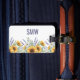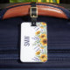 Personalize your travel gear with these vibrant watercolor floral luggage tags. The design showcases a bright arrangement of sunflowers and lavender sprigs against a crisp white and deep navy contrast. These durable tags are ideal for identifying your suitcase on a summer honeymoon or gifting to your bridal party.