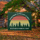 Cool custom sunset yard sign for a vacation rental home in beautiful forest green. Cool personalized family lake house signage for your log cabin getaway customized with your last name and established date under the trees. Perfect addition to a bed and breakfast.