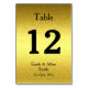 Personalized wedding table card with template text for a number, names and date; golden and yellow retro design with bokeh circles texture;