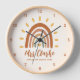 Custom Teacher Name Quote Boho Rainbow Sun Classroom wall clock is a unique and stylish accessory that combines bohemian and earthy elements with a vibrant rainbow sun. In addition to the striking graphic, the clock can also be customized with your teacher name, as well as the grade or any other quote, wether it be about kindness or classroom rules, making it a truly personalized piece. The name will be printed in a stylish and modern script font below the sunburnt orange illustration. This makes an awesome personalized teacher appreciation gift for back to school or end of year!