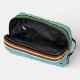 This toiletry bag design features a stunning teal blue, sage green, dark and medium brown, and ivory cream colored horizontal stripes art pattern design on a black background. The variety of this color combo creates a dynamic and rhythmic effect. The pattern is both ornate and elegant, with a touch of funkiness and hipster flair. There is also room to customize or personalize with a monogram or initial of your choice. Whether looking for a chic and modern style or a vintage and retro trend vibe, this pattern will suit your taste and personality.