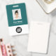 Easily personalize this Custom Employee Name Badge with Photo, Scan Bar Code and business logo. A simple business design in teal dark green and white colors fully customizable in front and back sizes, sans-serif basic and modern fonts and a professional and clear look. Avaiable with lanyard, metal clip or with retractable. No minimum order.
