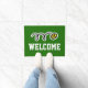 Custom tennis ball design welcome doormat. Make your own custom monogrammed indoor / outdoor door mat with custom background color and text. Add your own welcome message, family name, surname, initial letter or funny quote. Fun gift idea for new club, home / housewarming, store, shop, company office, business etc. Modern sport typography with crossed tennis rackets. Personalizable template. Create your own classy entry mat / rug for front door / entryway or hall. Customizable home decor / decorations for your house. Gift ideas for tennis player, fan, coach etc. Green or custom color background.