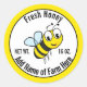 A cheerful bee is in the center of this honey jar label. You can edit the text to create your custom message. The display text says 'Fresh Honey NET WT. 16 OZ. Add Name of Farm Here. The sticker is round. The bee is inside a white circle that has a black and yellow border. The text is black.