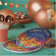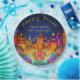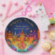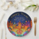 A vibrant Diwali celebration captured on a paper plate. The plate features a dark blue background with a stunning illustration of an Indian palace skyline lit up by colorful fireworks. At the center, a beautiful lotus flower adds a touch of elegance and spirituality.