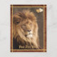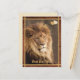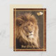 A close up of a beautiful lion's face. Gorgeous big cat photograph image. With a beige text that is ready for you to add any text. Fully customize. With a textured, rustic, grunge, dark brown background and gold bars framing the picture. Every element can be moved around, resized, or deleted. Wildcat lovers photography.