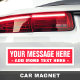 Customizable car magnet with templates field for your message. Two lines of text. White text on red background with white border.