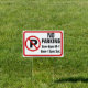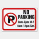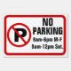 No parking sign with a crossed out P in red white and black. Customize the parking details including hours available or restricted. Great for a business parking lot, or street parking area.