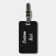 This black luggage tag has text in a white script. The text can be edited or deleted.