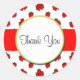 A custom Thank You sticker with script letters and a pattern of wild strawberries behind a simple gold medallion and a faux red ribbon. Click Customize It to change fonts, sizing and more, even save your design for later.