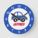 Custom toy car wall clock for kids bedroom or baby nursery. Personalized wallclock with custom name of child. Cute baby shower or 1st Birthday gift idea for little boys room. Red auto vehicle decoration with personalizable name or monogram. Home decor for childrens room wall. Make your own unique present for grandson, nephew or son.