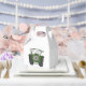 A tractor country farm wedding favor box which can be personalized. The bunting in the tractor is in a subtle cream and white. The perfect wedding favors for a couple who are having countryside farm wedding.