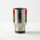 A Travel Mug to personalise, with a cheerful all-over pattern of red, orange and yellow flowers on a bright turquoise background, from a handpainted paper collage by Judy Adamson.