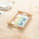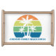 This cool personalized tropical beach house serving tray features 3 palm trees silhouetted against an orange and blue sunset accented with yellow and green at the coast. Customize this coastal family home gift for your summer getaway on the island.
