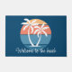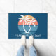 Stylish contemporary and classy image of teal blue, dark and light colored orange colored seashore sunset on a tropical and exotic Hawaiian island beach with white palm trees. With the option to customize or personalize with a welcome text or family name of your choice. A cute, modern and pretty decorative design for the lover of Hawaii or the Caribbean, beaches, the ocean, sea, the beauty of the tropics, and popular summer vacation destinations.