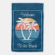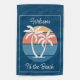 Stylish contemporary and classy image of teal blue, dark and light colored orange colored seashore sunset on a tropical and exotic Hawaiian island beach with white palm trees. With the option to customize or personalize with a welcome text or family name of your choice. A cute, modern and pretty decorative design for the lover of Hawaii or the Caribbean, beaches, the ocean, sea, the beauty of the tropics, and popular summer vacation destinations.