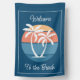 Stylish contemporary and classy image of teal blue, dark and light colored orange colored seashore sunset on a tropical and exotic Hawaiian island beach with white palm trees. With the option to customize or personalize with a welcome text or family name of your choice. A cute, modern and pretty decorative design for the lover of Hawaii or the Caribbean, beaches, the ocean, sea, the beauty of the tropics, and popular summer vacation destinations.