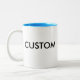 Custom Two-Tone 11oz Ceramic Mug - LIGHT BLUE Inside, 4.8” high x 3.2” diameter. 11 oz or 15 oz options. Microwave and dishwasher safe. FDA food and beverage safety approved. Black, lime, maroon, navy blue, orange, pink, red, yellow, hunter green, and light blue color options.