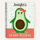 This custom recipe book features a cute avocado and a pattern with cook utensils.