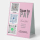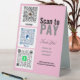 Customize this custom Venmo business transactions sign with your business name and even remind them to as for a review on social media. Add your own Venmo, PayPal, or Cash App QR code image to this tabletop Pay HERE sign. Digital payment systems make paying at craft shows and popups so much easier. Scanning a QR code allows people to pay for goods and services through a digital wallet when they have run out of cash. Customers scan your QR code and transfer money right into your account. This pay-here sign is a must for your small business.