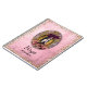 Custom Vintage Virgo Pink Gold Glitter Notebook with a gorgeous Virgo woman with purple flowers in her hair inside a floral vintage frame. The background is distressed pink-purple linen framed with gold glitter.