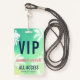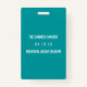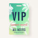 Perfect for summer concerts, music festivals and large event venues, this customizable badge features a background of white palm tree silhouettes against tropical green background, with white and coral text overlays. Customize for VIPs, staff, press or other uses, with four lines of text on the front. Add additional event information to the back of the badge in white lettering on turquoise.
