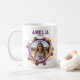 Custom Volleyball Player Photo Sports Coffee Mug. Featuring a vibrant purple and gold design, this custom keepsake allows you to proudly display a photo of your athlete, along with their name and a year. Perfect for commemorating a successful season, or a special gift. It's a wonderful way to capture memories and show team spirit for years to come.