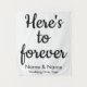 custom wedding backdrop for reception, wedding reception calligraphy back drop, wedding photo booth tapestry backdrop, wedding reception banner, here's to forever, custom wedding backdrop for ceremony, wedding photobooth rustic wedding decor, engagement party bridal shower banner, wedding head table couple backdrop, personalized names wedding back drop