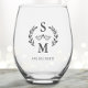 Custom Wedding Modern Monogram Wreath Crest Gray Stemless Wine Glass