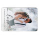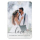 Celebrate your wedding with this keepsake flexible magnet, featuring the word "love" in elegant charcoal gray handwriting script with swashes at the beginning and end. Personalize it with your names and wedding date, and replace the sample image with your favorite wedding photo. A white gradient filter helps make the text pop.