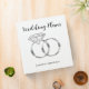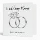 This wedding planning binder says Wedding Plans on the front with an illustration of diamond wedding rings below it and the names of the bride and groom.