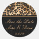 Round Wedding sticker Save the Date shown in a black and safari leopard print.