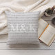 Creative wedding vow keepsake throw pillow in pale gray features your initials in white, with your wedding vows overlaid in handwritten script lettering. Paste your wedding vows into the template field, then click to "customize further" where you can adjust fonts and sizes. Pillow reverses to wide gray and white stripes. A unique and creative gift for newlyweds.