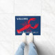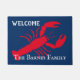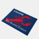 Custom welcome door mat with red lobster design. Make your own custom monogrammed indoor / outdoor doormat with custom background color and text. Add your own welcome message, family name, surname, initial letter or funny quote. Cute gift idea for new home / housewarming, wedding venue, store, fish shop, company office, business etc. Vintage typography template. Create your own unique entry mat / rug for front door / entryway or hall. Customizable home decor / decorations for nautical beach house. Cute maritime gift idea for sailing / boating enthusiast, couple, sailor, boat captain or newly weds. Navy blue and red colors.