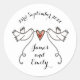 An illustration of 2 beautiful doves holding flowing ribbon with a love heart attached.