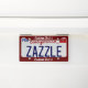 There are two places for you to add text to this dark red license plate frame. The text is a white script. All text can be edited or deleted.