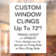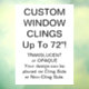 Custom personalized vinyl window clings - for windows & glass doors of stores, coffee shops, restaurants etc, and for business promotion & branding. Sizes up to 72" x 52"! These 7.5mm static cling vinyls are also fun for home, and for kids' bedrooms & nurseries. No tack - sticks to glass with static electricity! Simply peel away to reposition/remove.