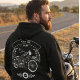 Gear up for winter! Custom zip-up hoodie featuring a cool skull logo on front chest & large vintage motorcycle art on back. 2-sided biker design. Personalize it: easy templates for rider name or club. Warm, stylish cold-weather coat. Ultimate Christmas gift for mechanics, chopper lovers & dads.