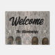 Welcome your guests with a funny two worn out pairs of boots on a slab of stone. Personalize the text, remove any text or edit using the design tool to select a font style, size, and color you prefer. A great housewarming or wedding gift idea. You can also add this design, where it fits appropriately, to one of the products shown in the transfer scroll bar on this page like the yard sign or bath mat.