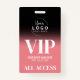 Special Event Your Logo Pink Black All Access VIP Badge. Great for fashion shows, concerts, large special events like conferences, speakers, and can even work for a birthday party or any other party where you want to make your guests feel special. A simple modern, yet elegant, look with a spot to add your company or even logo up top (or replace with a fun icon if doing for a birthday type of event). At bottom is a bold serif font mixed with simple typography, with VIP, the event name, date, and 'All Access Pass'. You can change all of the text information and colors of this badge (except the top black gradient.