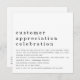 Customer Appreciation Day Business Invitation. Show your clients how much you value their support. The header is large in stylish lowercase with the details beneath. Lots of white space at the top for a contemporary feel! Easily personalise the text to your own details. On the back replace the sample image with your company logo.