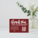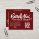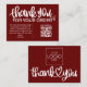 Express your gratitude with our dark red Customer Thank You Package Insert QR Code Coupon business card. This thoughtfully designed card features a QR code that leads your customers to an exclusive discount or special offer, showing appreciation for their loyalty. Make a lasting impression and strengthen your customer relationships with this personalized and stylish gesture.