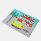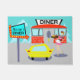 Serve up something special with this Customizable 1950's Diner Door Mat. The cartoon drawing design features a red brick building with blue windows, gray double doors, and a white sign that says, "Diner" perched on the roof. In the parking lot, a second sign is on a pole. The sign has a turquoise background and a flashing red arrow pointing the way to a diner. The customizable sign has done its job because there is a bright yellow car with fins parked next to it. Even though we can't see them, the passengers of the car must be smacking their lips. A cute, young carhop is rollerskating her way to the car. Her brunette hair is in a bouncy ponytail. She is wearing a short, pink uniform with black trim and a white apron. Balanced on one hand, the carhop is carrying a black tray holding a giant hamburger and a refreshing, old-fashioned, glass bottle of soda. The background behind the diner is teal with light blue clouds and the silhouettes of cedar trees.