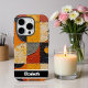 This bold phone cover showcases a heavily textured, impasto oil painting style, featuring a mosaic of geometric shapes in a vibrant and contrasting palette of oranges, yellows, reds, dark browns, and greys. The artistic, tactile design adds a modern and colorful flair to your device. A sleek black bar at the bottom offers personalization with a name like "Elizabeth"; if you don't want a name, you can remove it and any other elements you don't like from within the design tool, crafting a truly bespoke smartphone accessory.