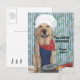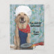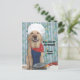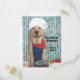 A yellow Lab in an apron, bone bandana, and chef hat with a pot with chicken legs hanging out. You can use it for a funny postcard or a funny customizable invitation to have friends over when you cook out or BBQ.