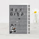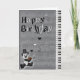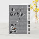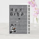 A Panda in a top hat plays happy birthday on a violin. Love hearts and music notes float upward and around the words happy birthday. Piano keys line the right of the card and sheet music fades in the background. A blue butterfly rests on the neck of the violin. This is a customizable card. Enter your own message on the inside.