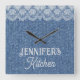 Tick-tock! Add a touch of Blue Jean Style to your Wall with this Customizable Denim Clock! Blue Denim Classic Jeans Texture Wall Clock featuring a Beautiful Lace Design. This Clock can't help but draw attention. Blue Jean Clocks make the Perfect Gift for any occasion or event! The Denim and Lace are Faux and Simulated. Personalize this Blue Jean Lace Clock to your Hearts content. Just Add Your Own Name!