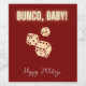 Bunco lovers unite and get ready for game night! Bunco, Baby! text in yellow neon with matching rolling dice has a vintage / retro feel. Customize "Happy Holidays" for a personalized gift.